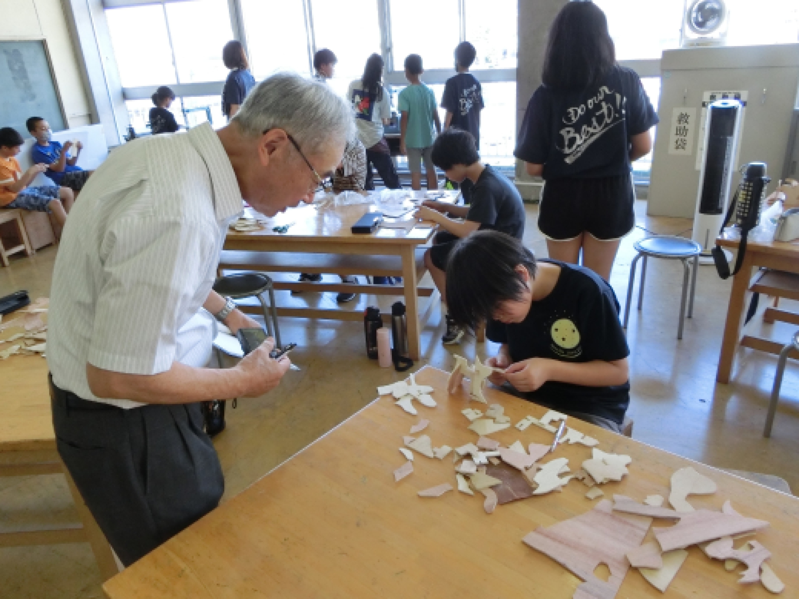 6年生は、自由な線で板を切り、できた形を組む「糸のこスイスイ」