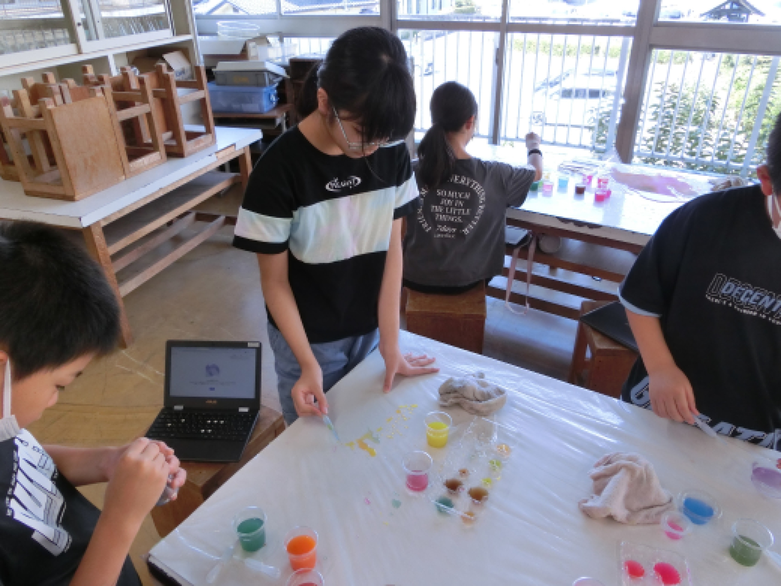 5年生は、色水と容器で形や色を表す「水から発見、ここきれい!」